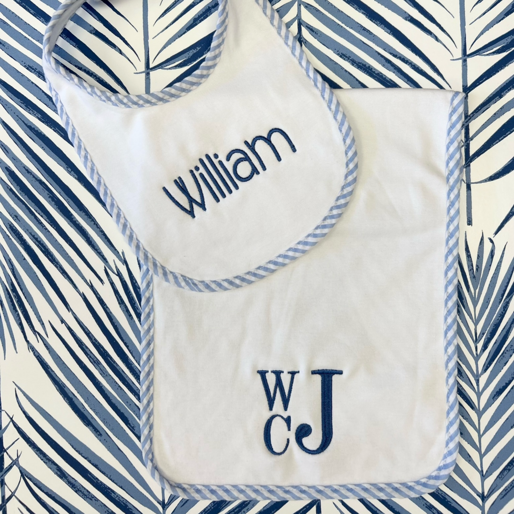 Keep your little one clean and stylish with our bib and burp sets! Made from 100% cotton on the front side and soft terry cloth on the back, this set is perfect for mealtime messes. The trim features a charming blue and white seersucker design. The bib fastens securely with velcro in the back for easy on and off. The generously sized burp cloth measures 10x18 inches, providing ample coverage. Don't forget to personalize it with embroidery for an extra special touch.
